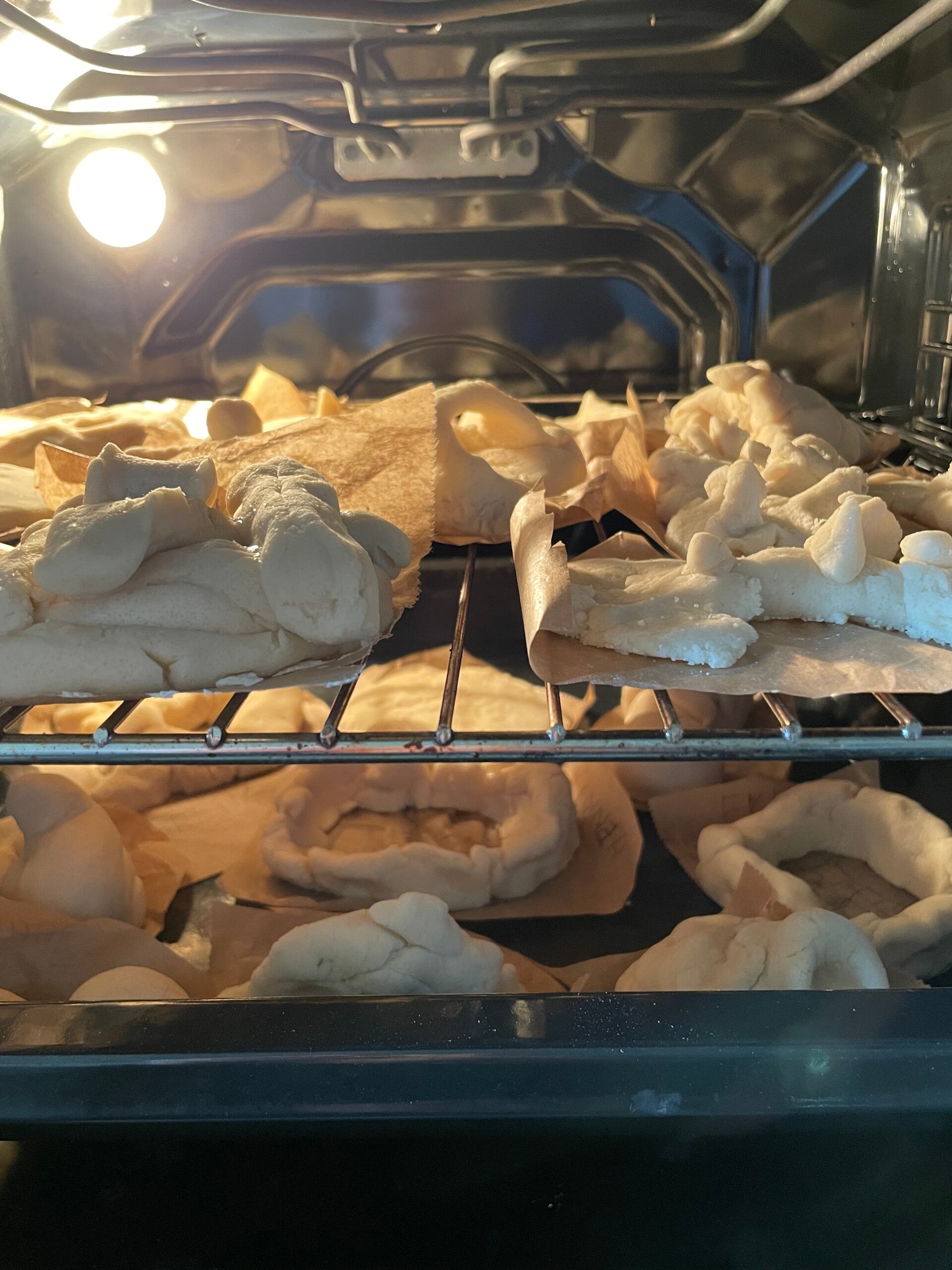 Die Plastiken aus Salzteig lassen sich wunderbar im Ofen backen, sodass sie hart werden. Hierfür kann selbstverständlich der Ofen von der Schule genutzt werden, so geht beim Transport nichts schief und der Aufwand ist geringer ;)